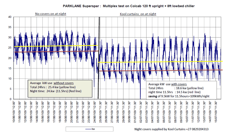 This graph shows the logging of power on the upright display cases at Parklane Superspar in PMB in winter 2009.